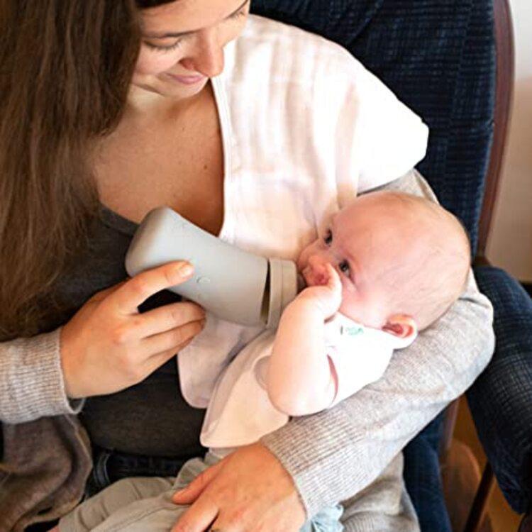 Patented easy-grip silicone cover—Silicone cover surrounds the bottle base to protect the glass and is soft and comfortable for parents and little ones to hold. U.S. Design Patent No. D911534.