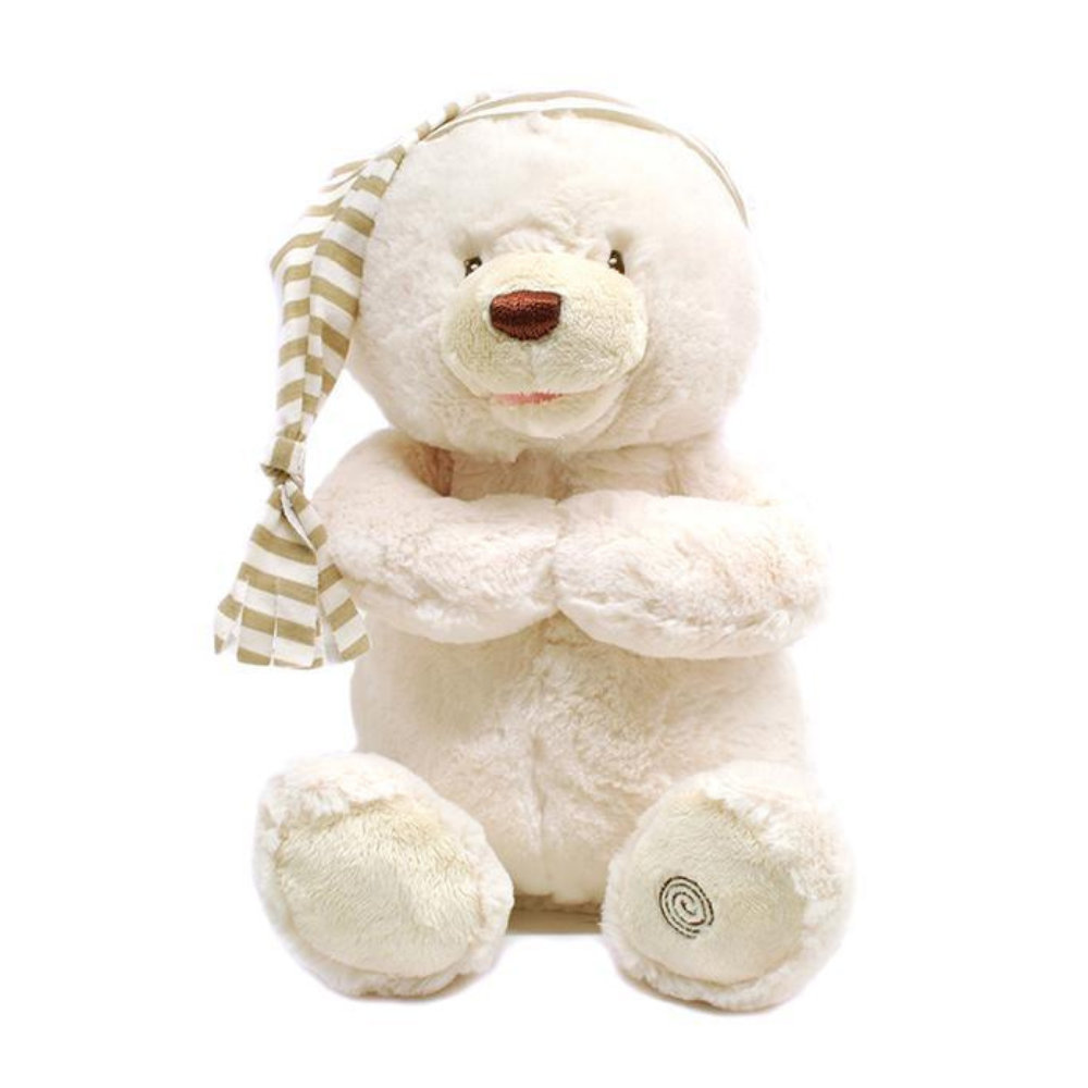 - ANIMATED PRAYING TEDDY BEAR: Goodnight Prayer Bear features animated head and mouth movement while reciting prayers, as well as a striped pajama cap for cutesy charm.