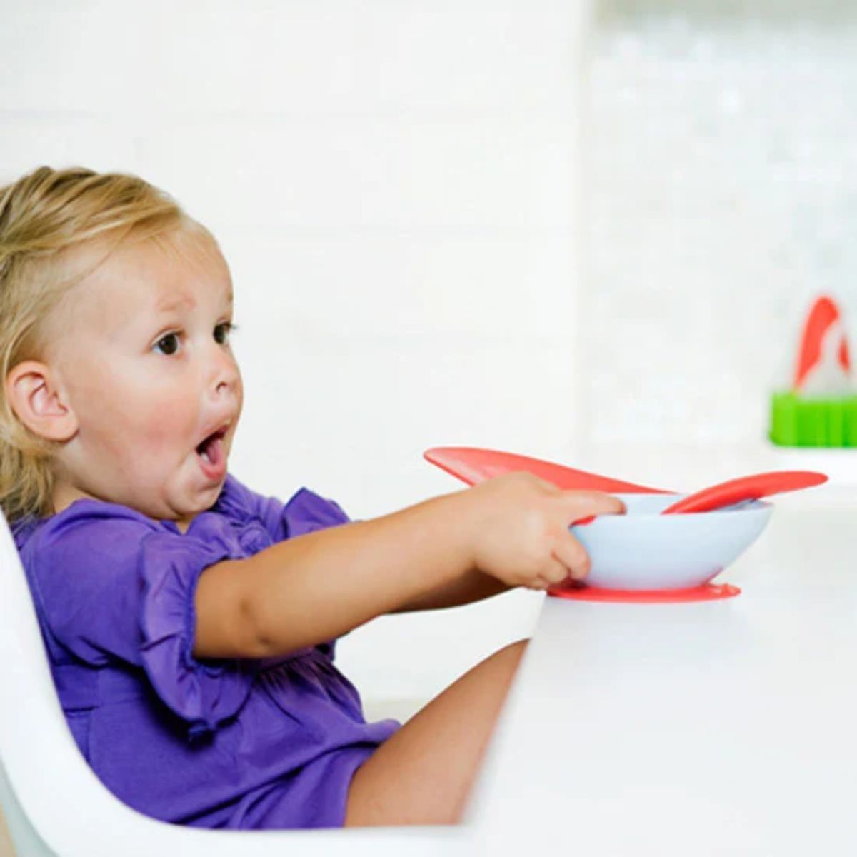 The vibrant CATCH BOWL with Spill Catcher from Boon features a long, flexible food catcher that catches dropped food so your first-time eater can try again to self-feed. A suction cup base holds the bowl securely in place so it doesn't fall on the floor.