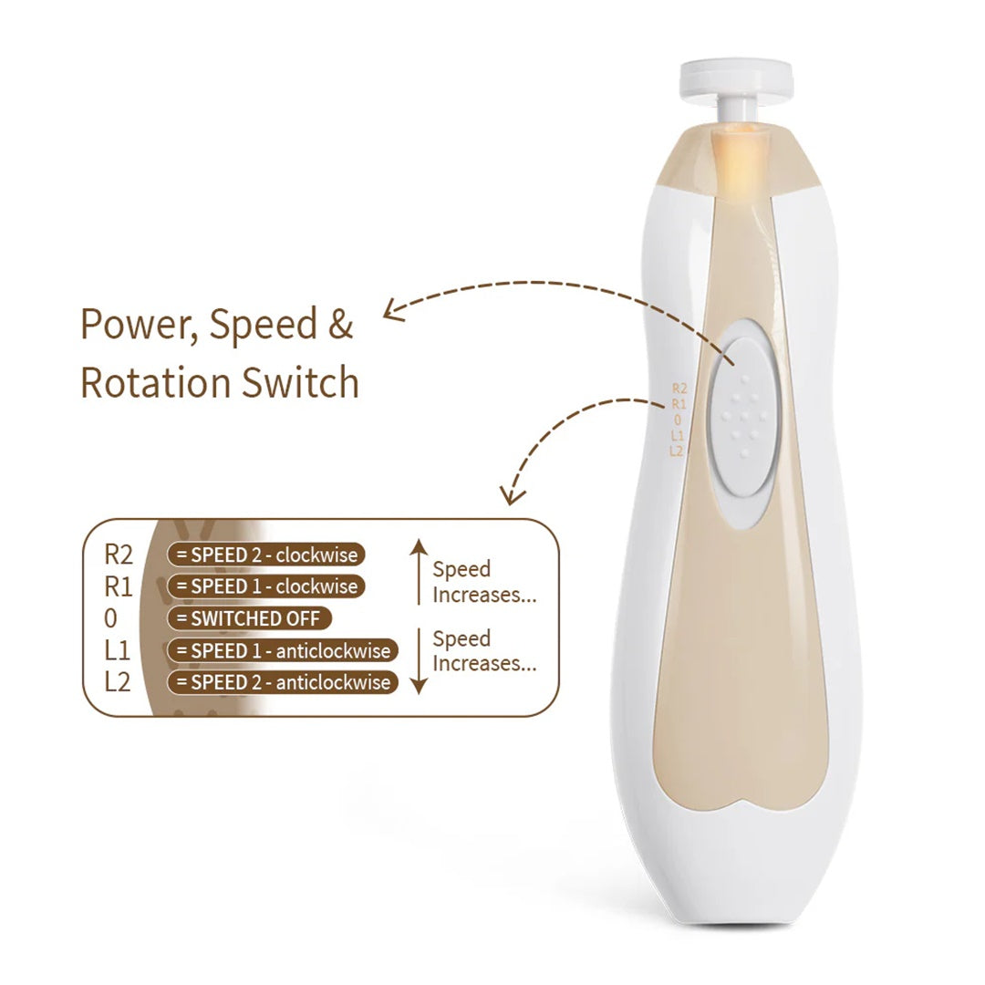 Our Baby Nail Care Set has two rotation directions and speeds to suit your needs. It's whisper-quiet and features a light on the end for easy nighttime filing!
