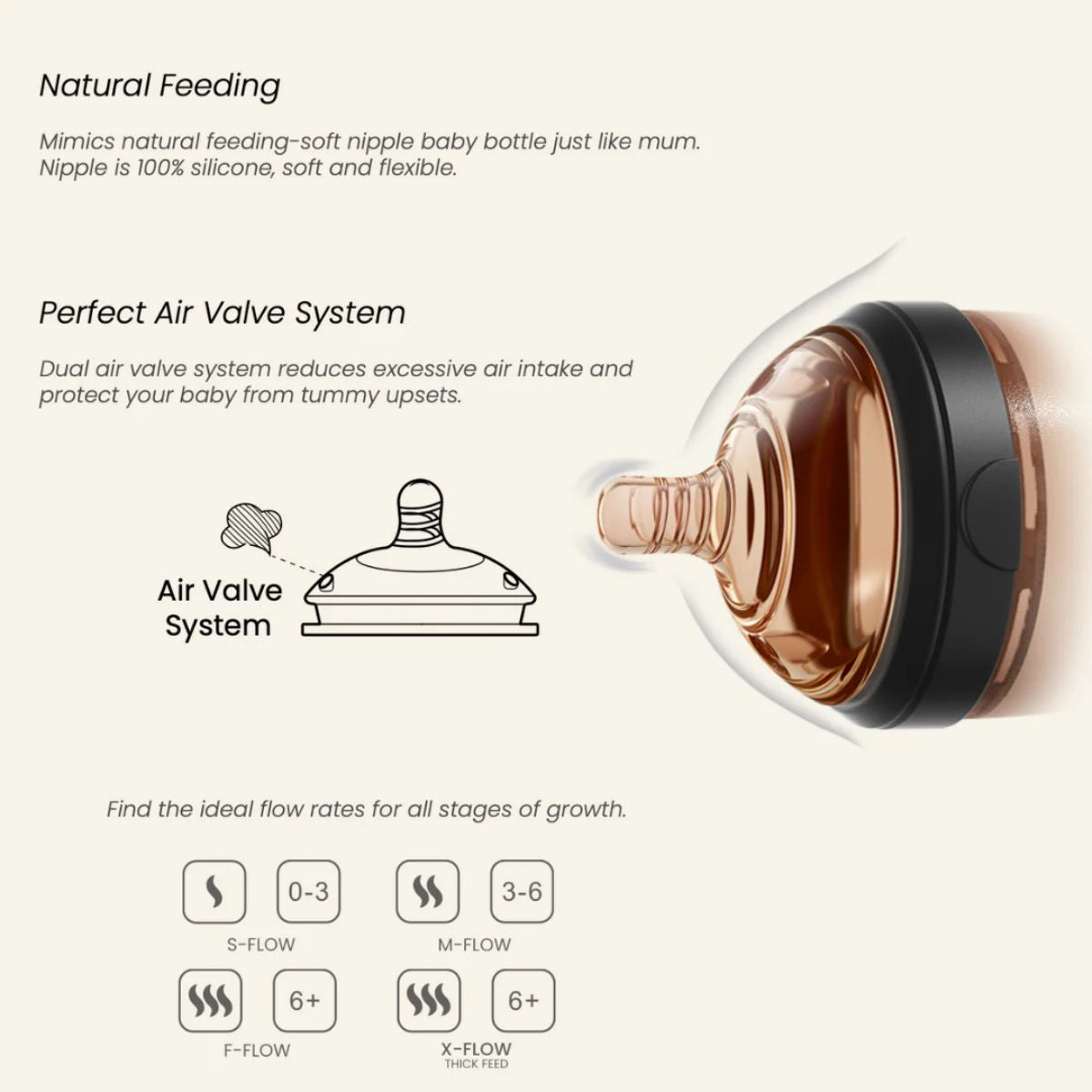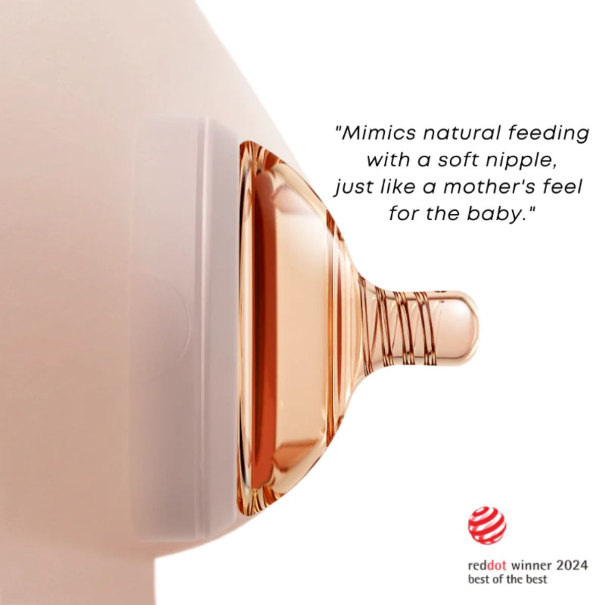 With its unique ultra-wide neck design, it helps your baby experience the natural feeling of feeding. Made from 100% medical-grade silicone, the soft and flexible nipple mimics the feel of a mother’s skin, providing a calming and soothing feeding experience. It also reduces air intake, minimizing the risk of colic and spit-up.