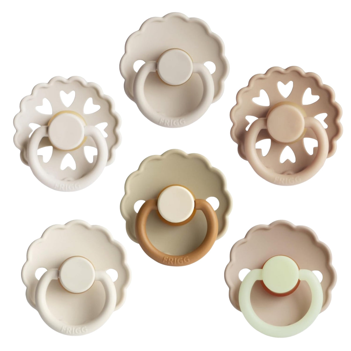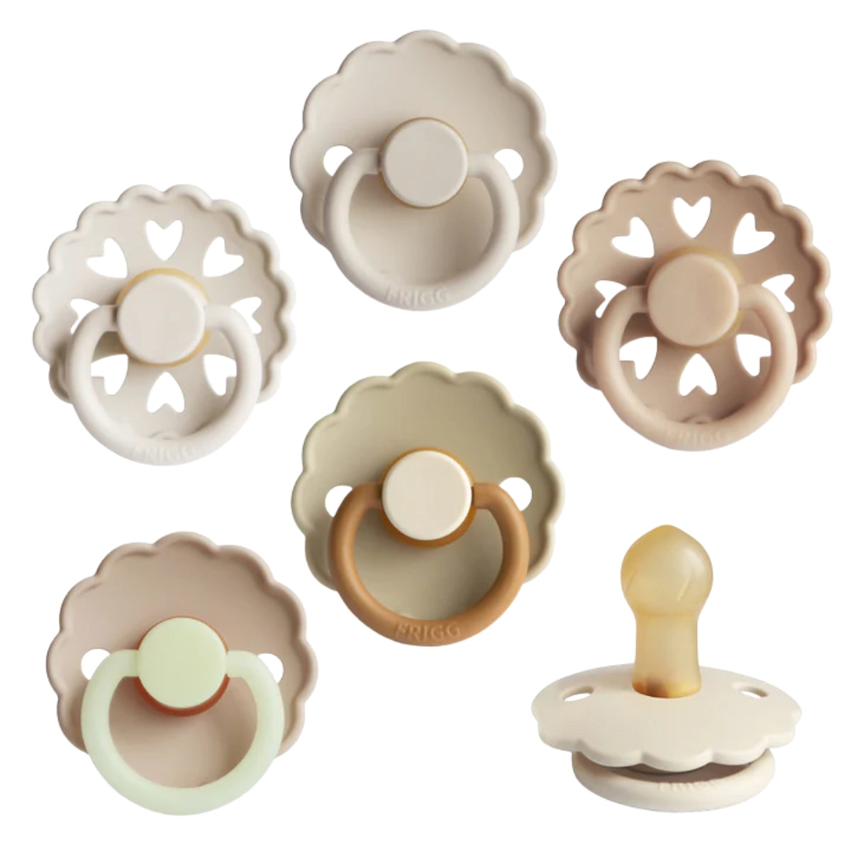 - Pacifier Styles Included: Frigg Fairytale Andersen (Cream), Frigg Daisy (Croissant Night), Frigg Daisy (Desert), Frigg Fairytale Andersen (Silky Satin), Frigg Daisy (Sandstone), Frigg Daisy (Cream)