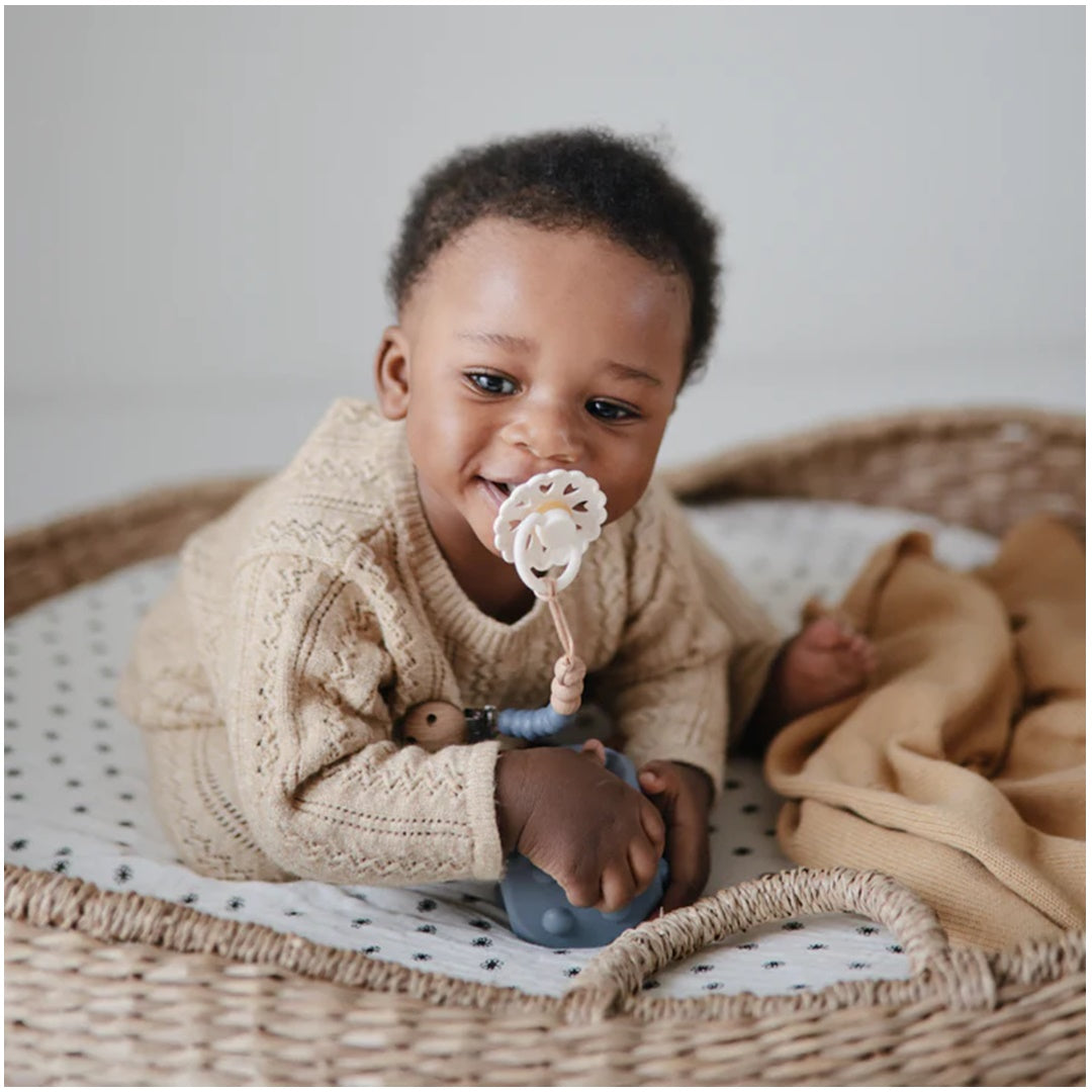 The FRIGG line of natural rubber and silicone pacifiers have been thoughtfully designed for your baby's comfort. The outward curve keeps the pacifier off their delicate skin, while features like air holes and a security handle ensure your baby stays safe. Available in a range of soft colors, FRIGG pacifiers make a beautiful addition to your collection of baby essentials.