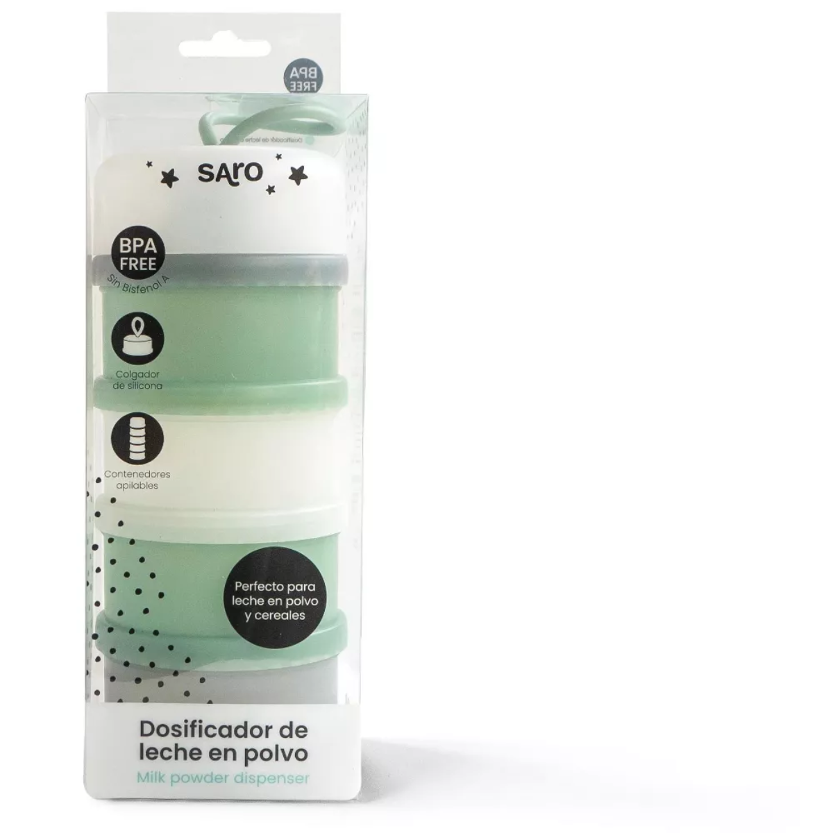 The SARO Hunter Formula Dispenser offers a practical and stylish solution for organizing your baby's meals on the go. This compact container, in a modern Hunter green shade, allows you to efficiently store pre-measured powdered milk or cereal, eliminating the need for bulky packages. Crafted from durable PP and food-grade silicone, it also features a convenient compartment to hold a pacifier. Its sleek design and easy-to-clean, dishwasher-safe material make it an essential accessory for streamlined feeding, whether you're at home or out and about.