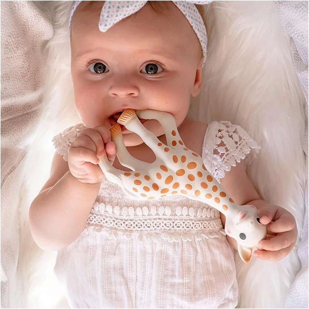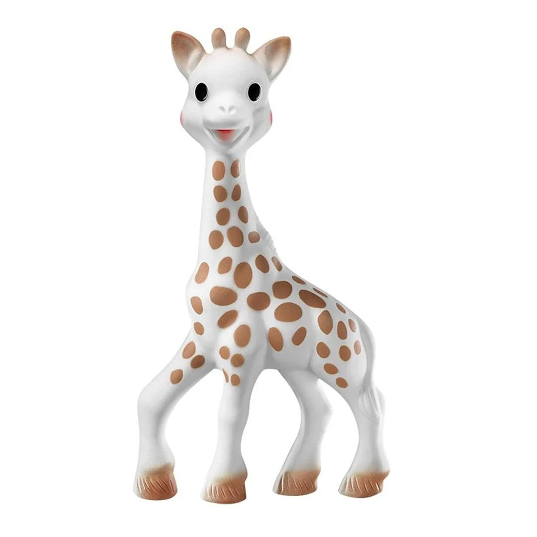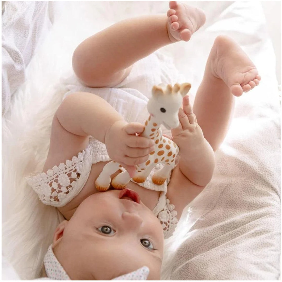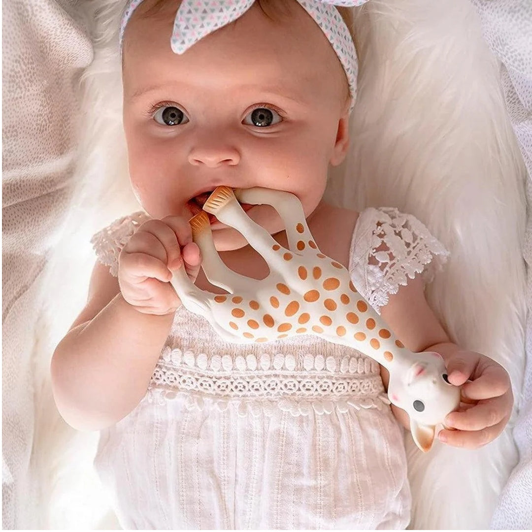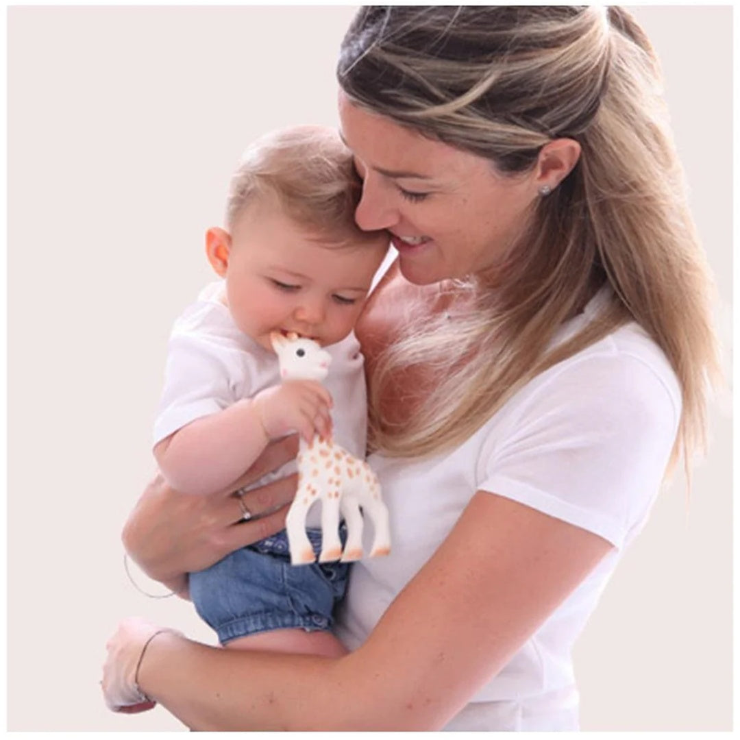 Most beloved teether of all time, Sophie La Girafe is very flexible and soft, perfect for your baby to grip, touch and chew on. Featuring dark and constrasting spots all over, squeaker sound and the singular scent of natural rubber, she will stimulate your baby's hearings and soothe his/her sore gums when teething.