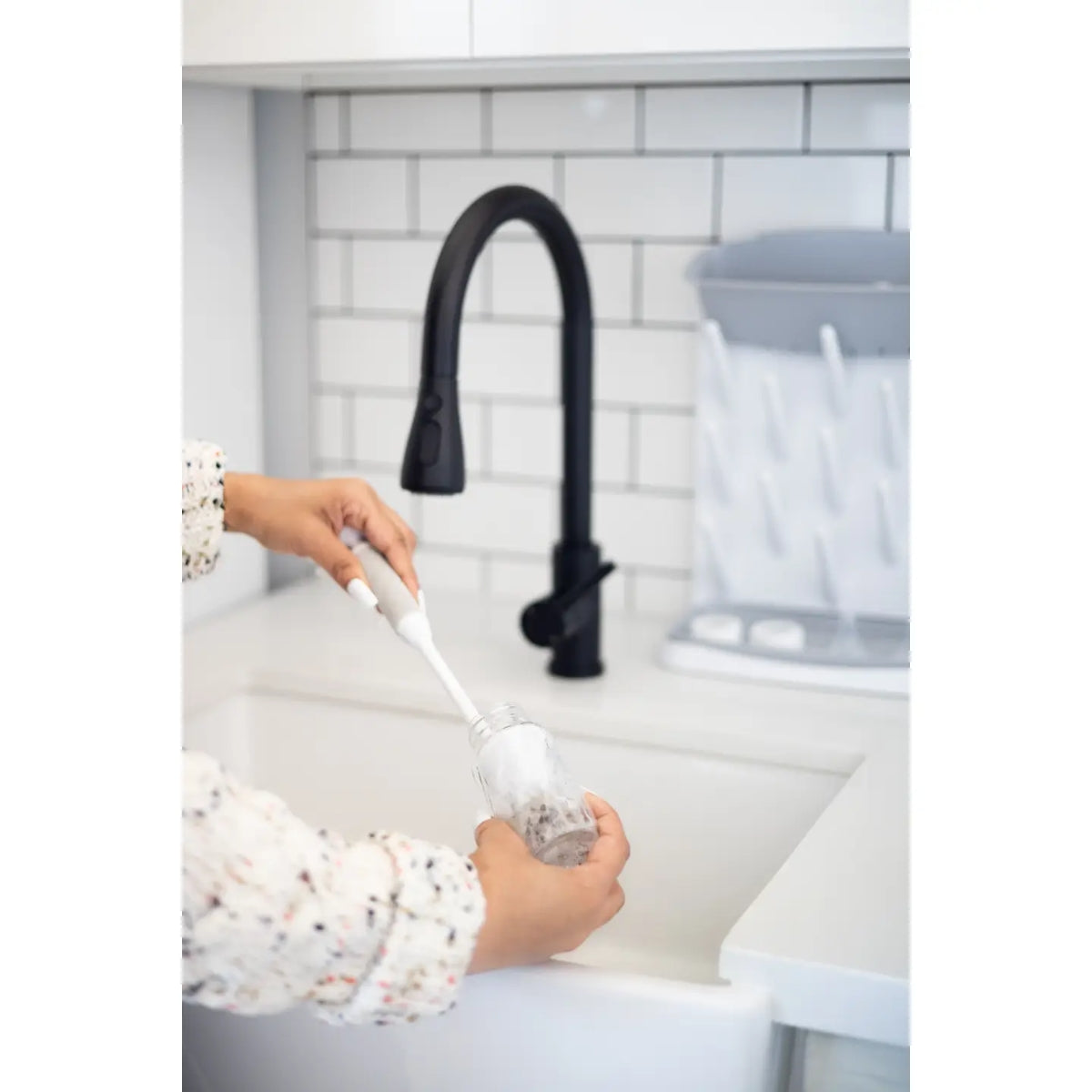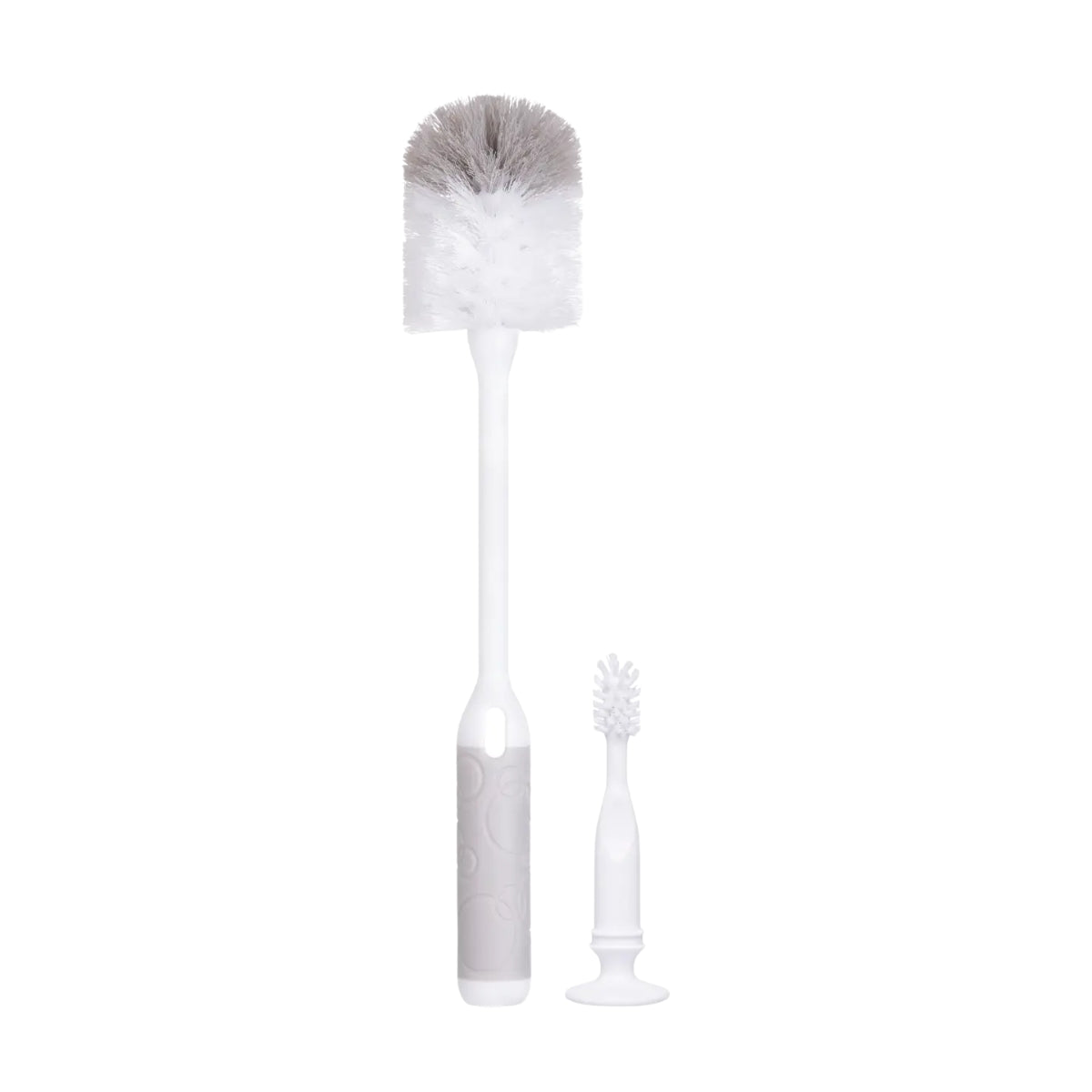 Includes both a full-sized cleaning brush for bottles and an integrated, small silicone nipple brush that fits into the handle. Comfortable, functional handle with a non-slip rubber grip ensures secure handling while cleaning.