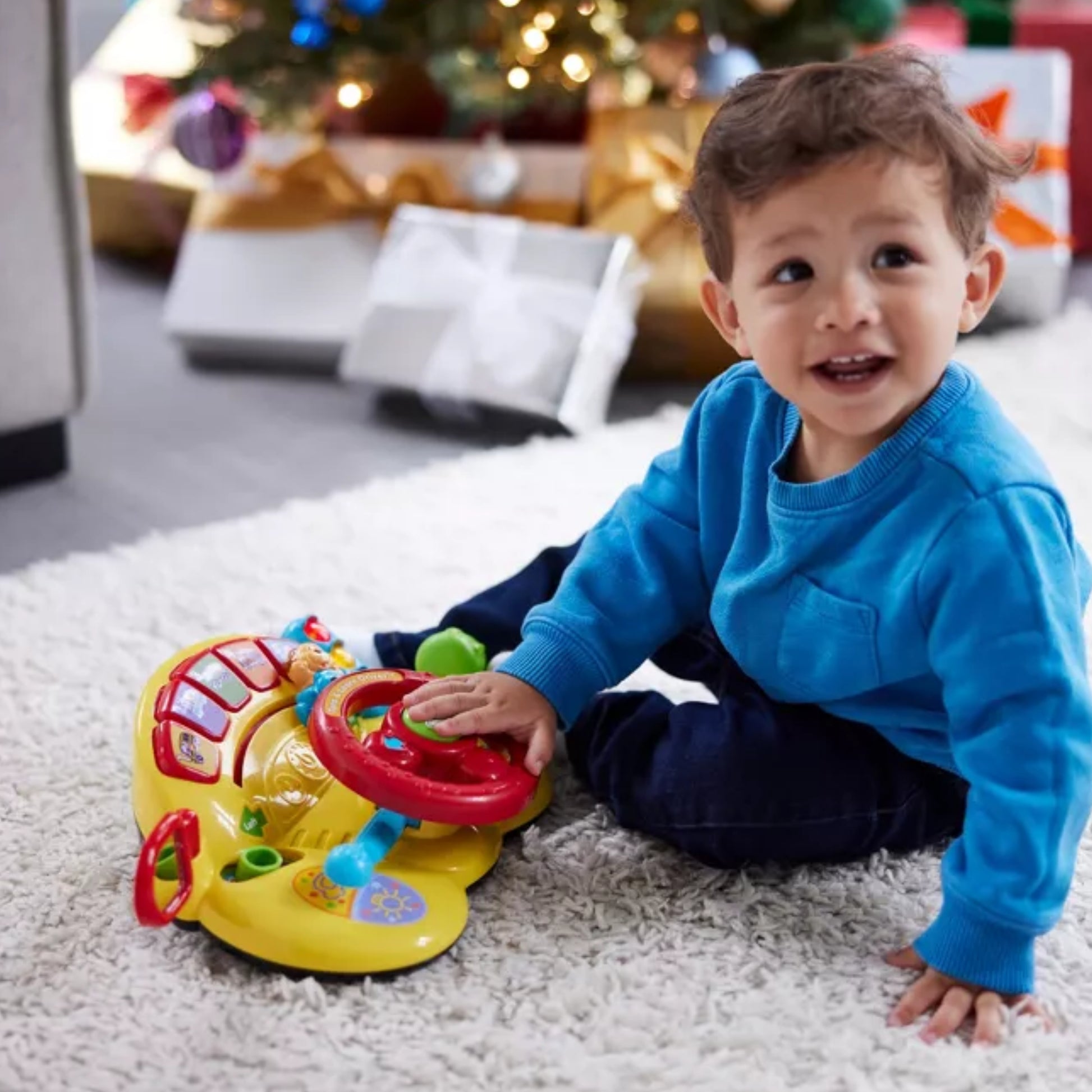 Interactive steering wheel toy with lights, sounds, and music designed to encourage sensory exploration, motor skill development, and imaginative role-play for babies and toddlers from 6 to 36 months.