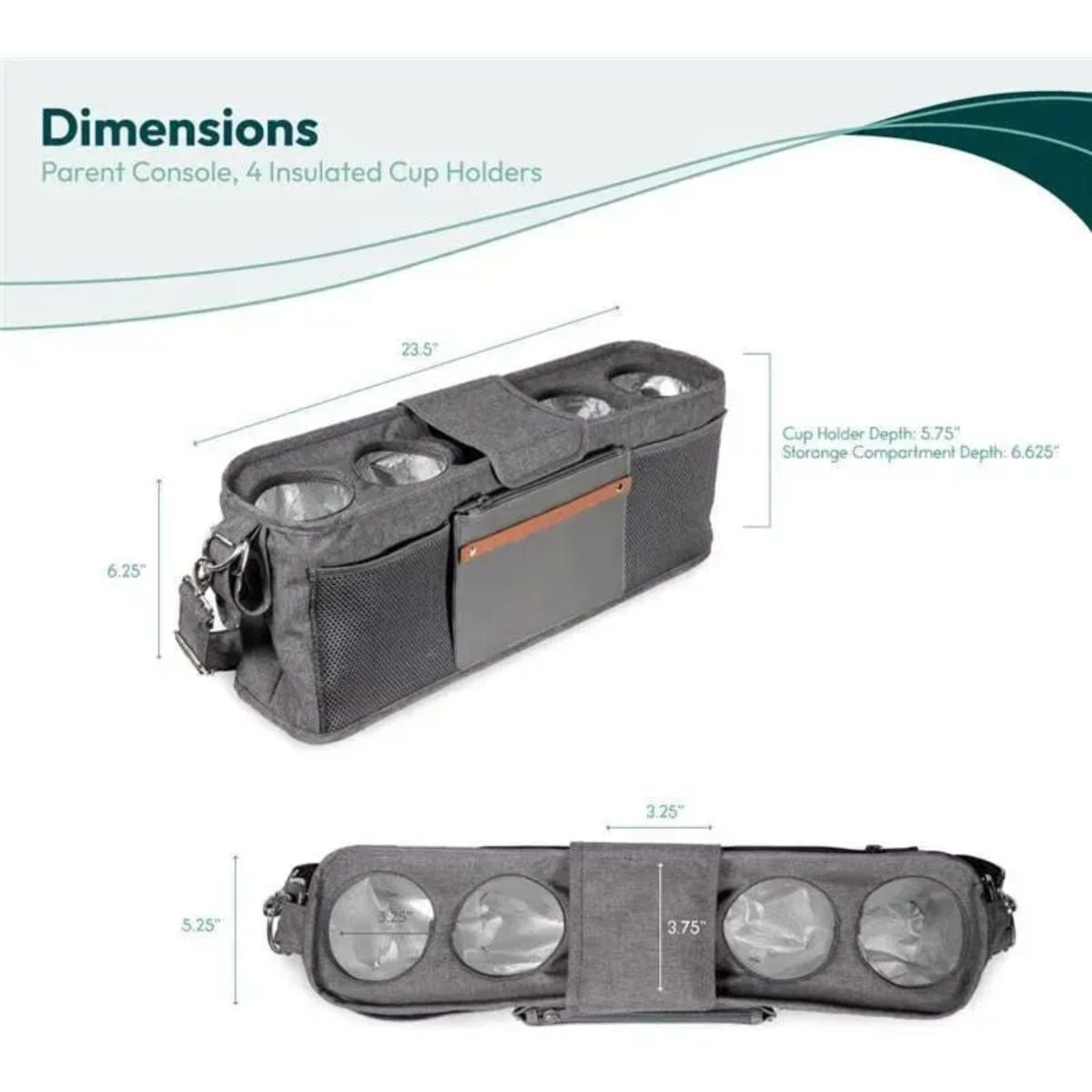 WonderFold 4-Seater Parent Console stores snacks, drinks & essentials, with insulated cup holders, removable clutch, pockets & shoulder strap.